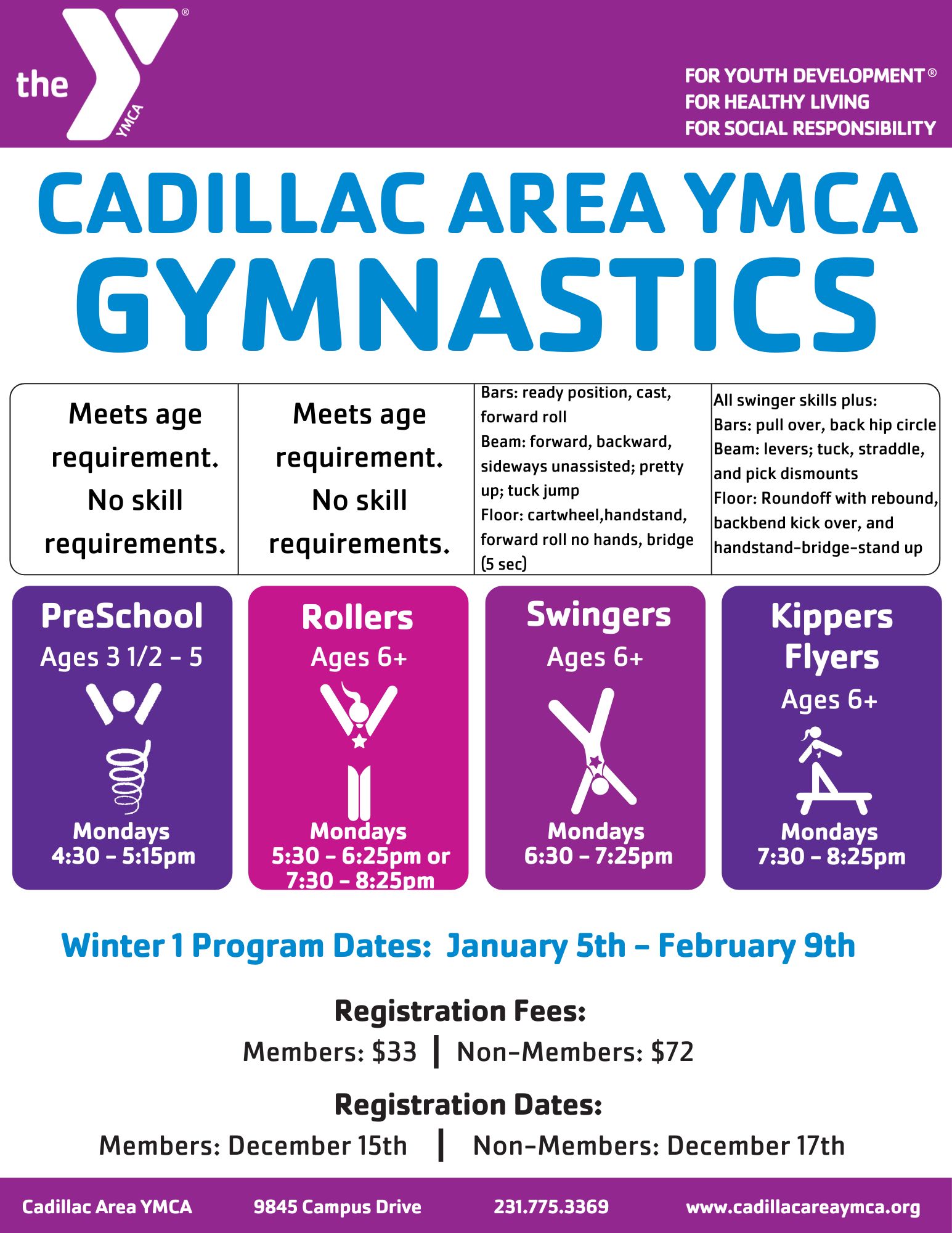 Join us this session for an age appropriate level of gymnastics. From our beginning level to our most advanced, get it all here at the Cadillac Area YMCA. Each session encompasses age and skill related training in the art of gymnastics. With lead instruction from Olivia, Lilly, and Avrie, you will learn all the essentials to progress in this program.